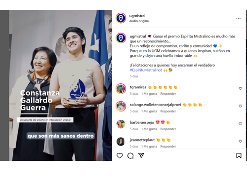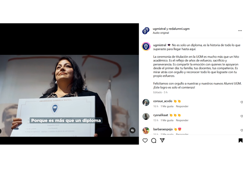Como Universidad Gabriela Mistral, felicitamos a nuestros nuevos graduados y graduadas, y les deseamos el mayor de los éxitos en esta nueva etapa. Les damos la bienvenida a nuestra comunidad de alumni y esperamos que sigan sintiéndose parte de la UGM. Confiamos en que, en su vida futura, actuarán con generosidad en el ámbito social y serán un reflejo fiel de los valores y conocimientos que su casa de estudios les entregó.