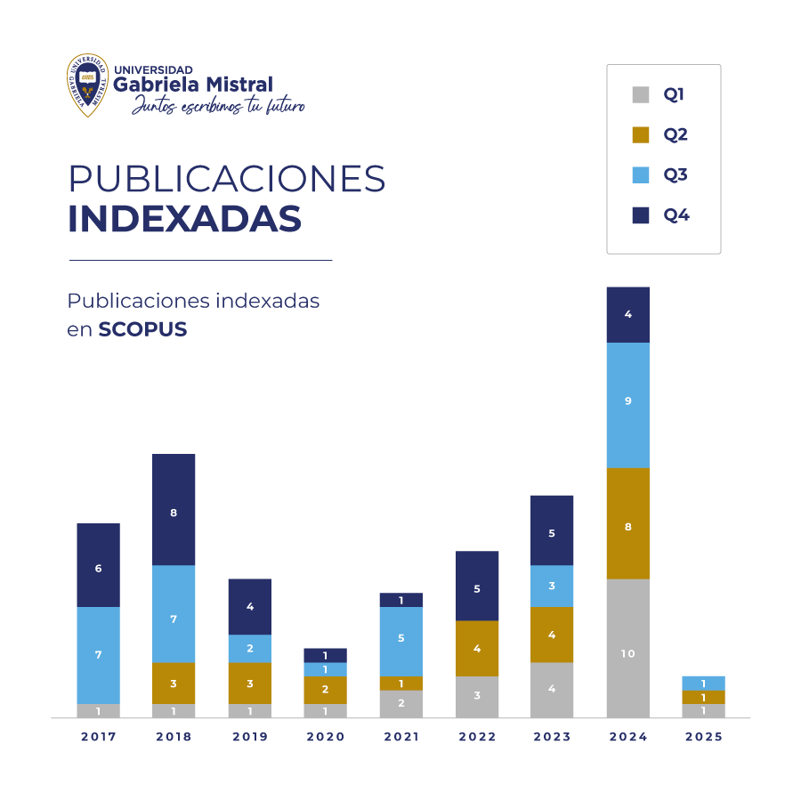 El gráfico presenta la cantidad de artículos científicos publicados en la Base de Datos Scopus con afiliación UGM desde el año 2017 hasta marzo del año 2025. En Scopus, la clasificación por cuartiles (Q1, Q2, Q3 y Q4) se utiliza para categorizar las revistas según su impacto y prestigio, basándose en métricas como el número de citas y el alcance de la revista. En este sistema, las revistas Q1 representan las de mayor prestigio e impacto, seguidas por las Q2, Q3 y finalmente Q4.