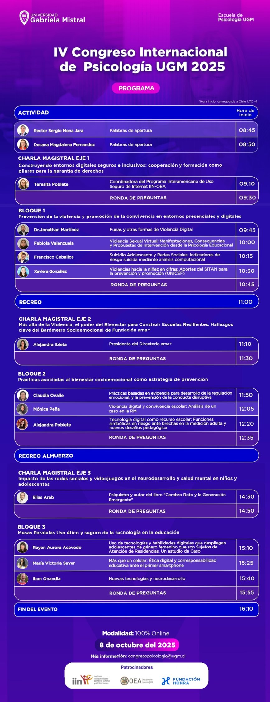 Estas son las temáticas y expositores y expositoras del "Congreso Internacional de Psicología UGM 2024: Buscando espacios libres de violencia en la niñez", realizado en octubre en una plataforma interactiva. Revisa quienes participaron.