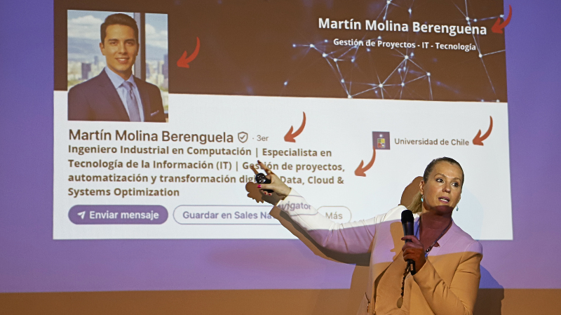La charla estuvo a cargo de Constanza Ibieta, directora de Elévate y Conecta y especialista en marca personal, quien compartió su experiencia en la creación de perfiles efectivos y en el análisis del funcionamiento del algoritmo de la red. Recalcó así la importancia de construir un perfil completo, con una URL personalizada, una fotografía profesional, un titular claro y una sección de contacto definida.
