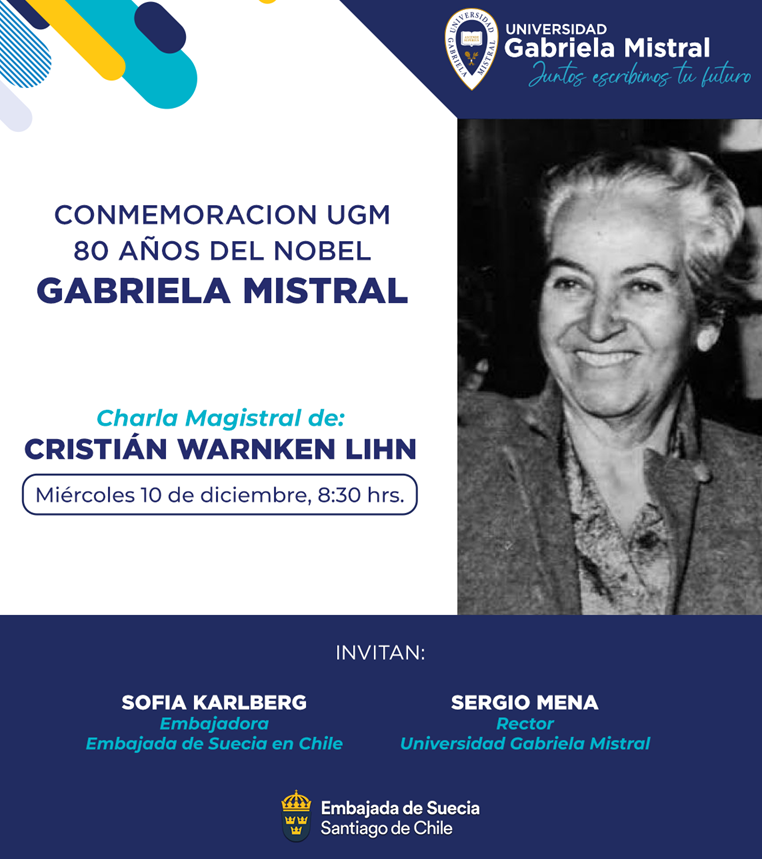 A nombre de las autoridades de la Universidad Gabriela Mistral y la Embajada de Suecia en Chile, nuestro Rector Sergio Mena Jara y la Excelentísima Embajadora Sofia Karlberg, invitan cordialmente a participar del Acto de Conmemoración de los 80 años de la entrega del Premio Nobel a Gabriela Mistral, que se realizará en la Universidad Gabriela Mistral el próximo día miércoles 10 de diciembre.