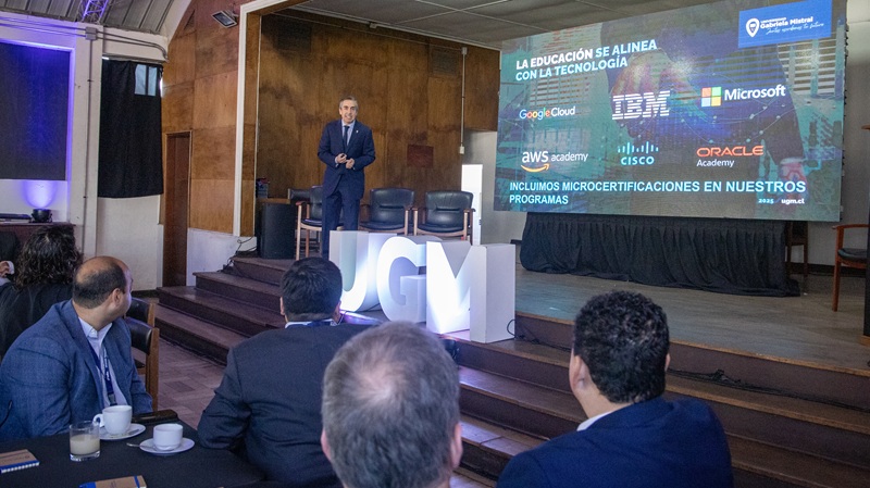 En la apertura del encuentro, el Rector Sergio Mena relató los principales hitos de la UGM, la actualización del proyecto institucional, las iniciativas académicas y los proyectos propios en los cuales están trabajando alumnos y académicos con la utilización creativa y ética de la IA; y los desafíos de la reconfiguración profesional y la irrupción de la Inteligencia Artificial, entre otros temas.