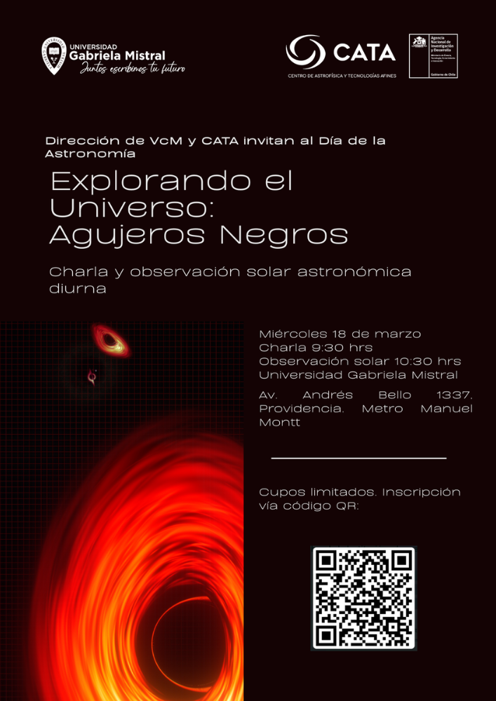 La Universidad Gabriela Mistral será sede de una jornada de divulgación científica organizada por la Dirección de Vinculación con el Medio, en conjunto con el equipo del Centro de Astrofísica y Tecnologías Afines (CATA), para aprender y conocer más sobre fenómenos astronómicos.